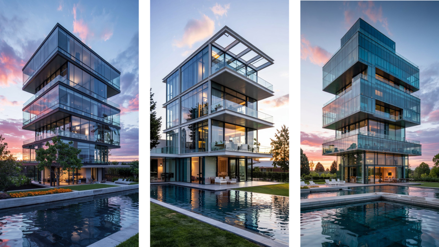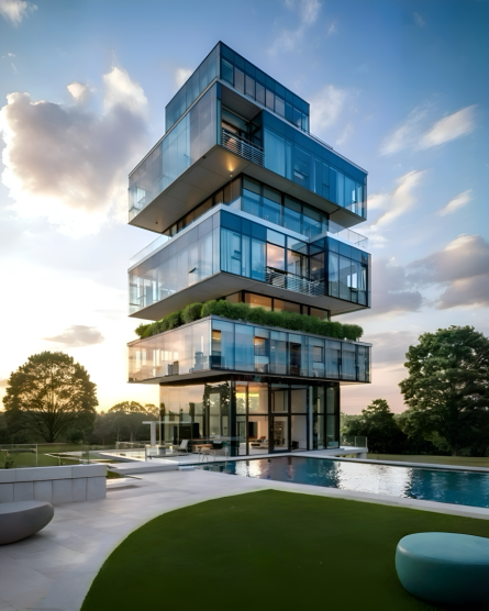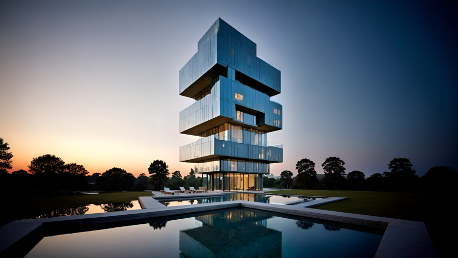 A multi-story building with a unique design featuring stacked, modular glass sections. In front of the building, there's a calm reflective pool that mirrors the building's structure. Adjacent to the pool, there are wooden loungers. The building's glass facade is reflecting the soft hues of the sky, creating a harmonious blend of nature and architecture.