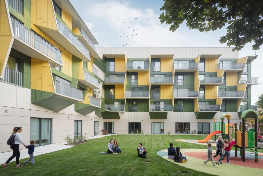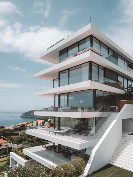 The building has a unique design with multiple overlapping horizontal layers, giving it a stacked appearance. The exterior is predominantly white, with large glass windows and balconies.