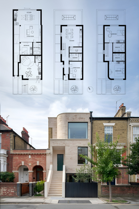 The soft curve at the upper corner responds gently to the rhythm of the street, introducing a subtle divergence. The main entrance is accessed via a raised stair, while the lower sunken dwelling is entered from a separate side entrance adjacent to the stair.